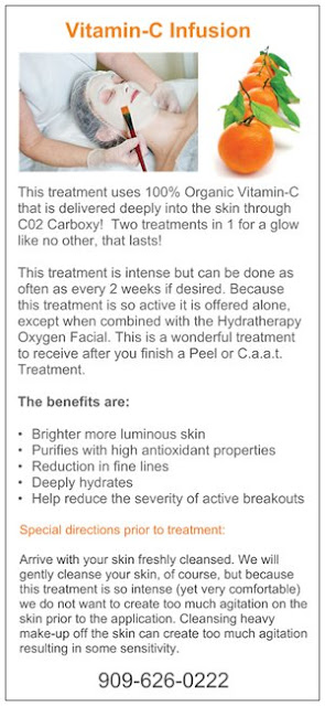 Now available, the new Vitamin-C Infusion. This treatment infuses a deep penetration of Organic Vitamin-C deep into the tissue of your skin resulting in an amazing glow!!